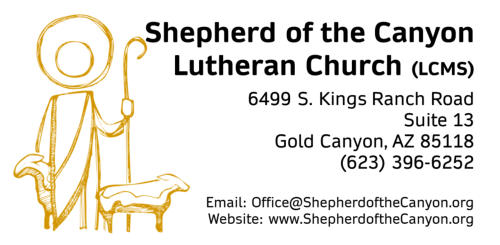 Would you like to financially support the ministry of Shepherd of the Canyon Lutheran Church?We appreciate the support of people who understand the need for a confessional Lutheran congregation in the Gold Canyon community.Your gift helps us bring the Good News of Jesus to the people in Gold Canyon.Click on the “e-Giving” button below to make a one-time or a recurring gift.Thank you.
